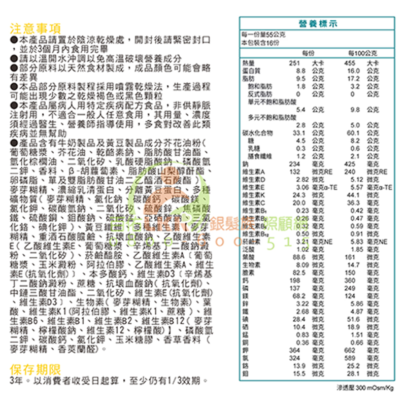 ◆市售NO.1,權威醫師推薦◆醫學中心指定2,九成家屬滿意3◆優蛋白黃金比例1 ,營養更均衡◆嚴選高品質濃縮乳清蛋白及分離黃豆蛋白◆蛋白質熱量佔比14.1%,提供完整必需胺基酸◆油脂來源為富含單元不飽和脂肪酸的芥花油◆未添加動物性油脂,奶素可食◆口飲/管灌皆適用,調整體質,改善營養狀態◆本公司產品皆已投保南山產品產物責任險2000萬