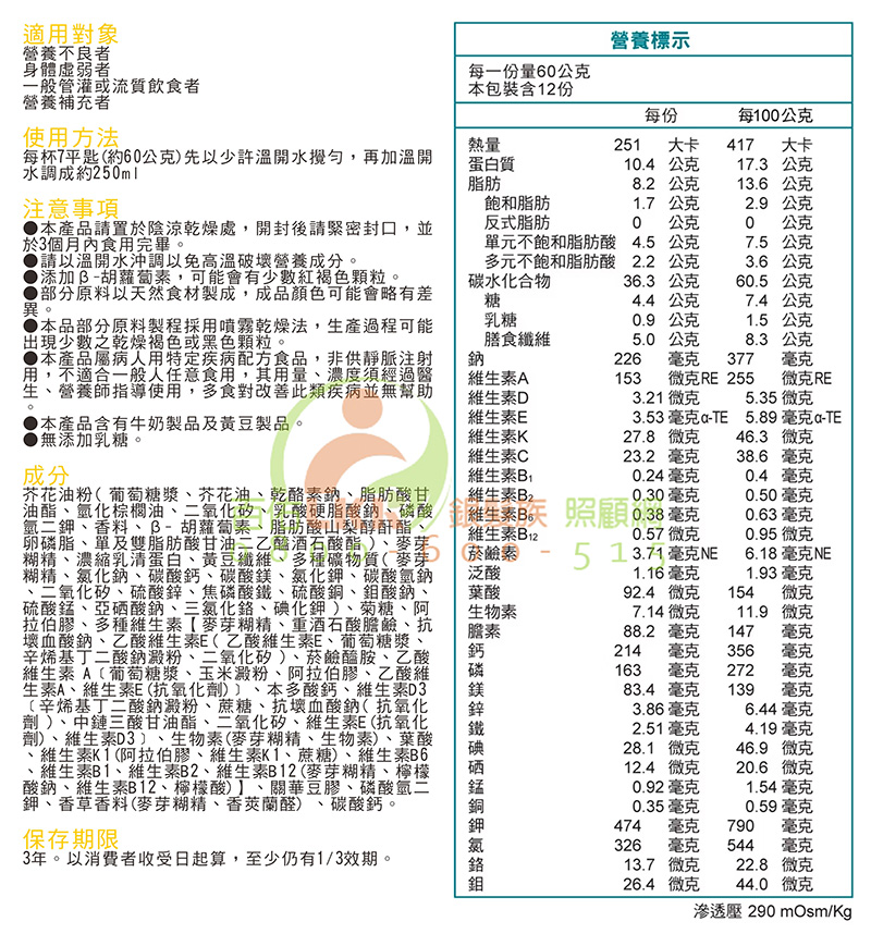 ◆市售NO.1,權威醫師推薦◆100%濃縮乳清蛋白,比一般牛奶蛋白更好吸收◆醫學中心指定2,九成家屬滿意3◆美國FDA認證A級乳源,萃取牛奶中20%精華濃縮製成◆蛋白質熱量佔比17%,提供完整必需胺基酸◆油脂來源為富含單元不飽和脂肪酸的芥花油◆未添加動物性油脂,奶素可食◆高達5g膳食纖維/份,輕鬆補充,促進腸道蠕動與健康◆口飲/管灌皆適用,調整體質,改善營養狀態◆本公司產品皆已投保南山產品產物責任險2000萬